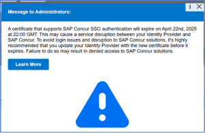A reminder message is now also being displayed on affected SSO sites within Concur.